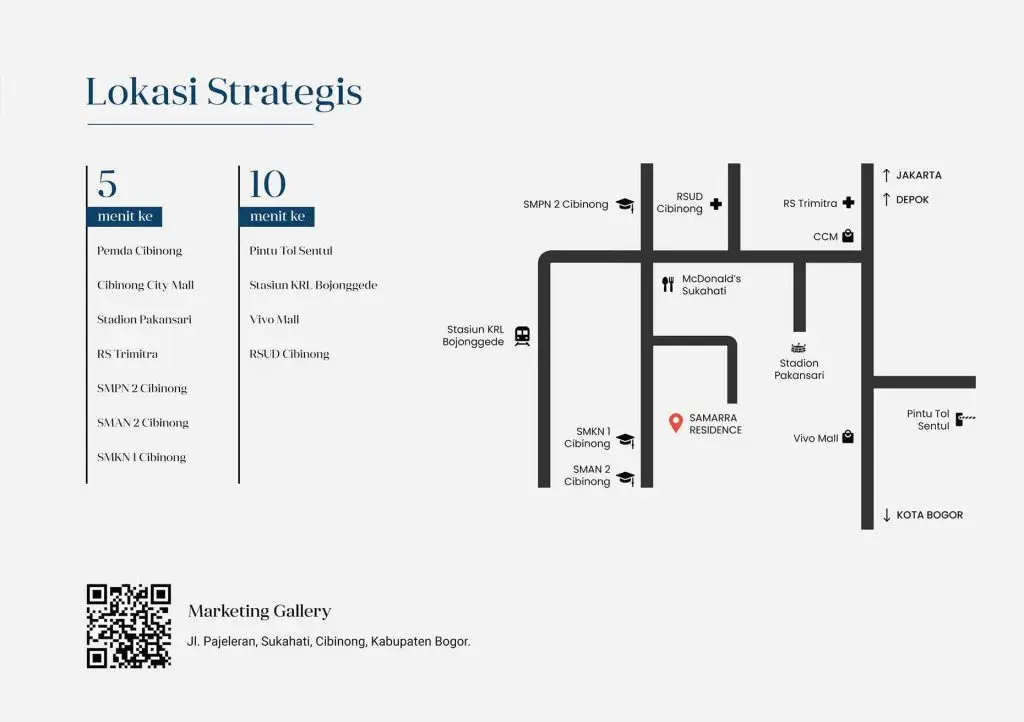 Samarra Residence berlokasi di Sukahati Cibinong hanya 5 menit ke Pusat Pemerintahan Kabupaten Bogor.ÂLuas lahan sebesar 5.088 meter dengan total 35 unit rumah, terdiri dari 20 unit rumah 2 lantai & 15 unit rumah 1 lantai.